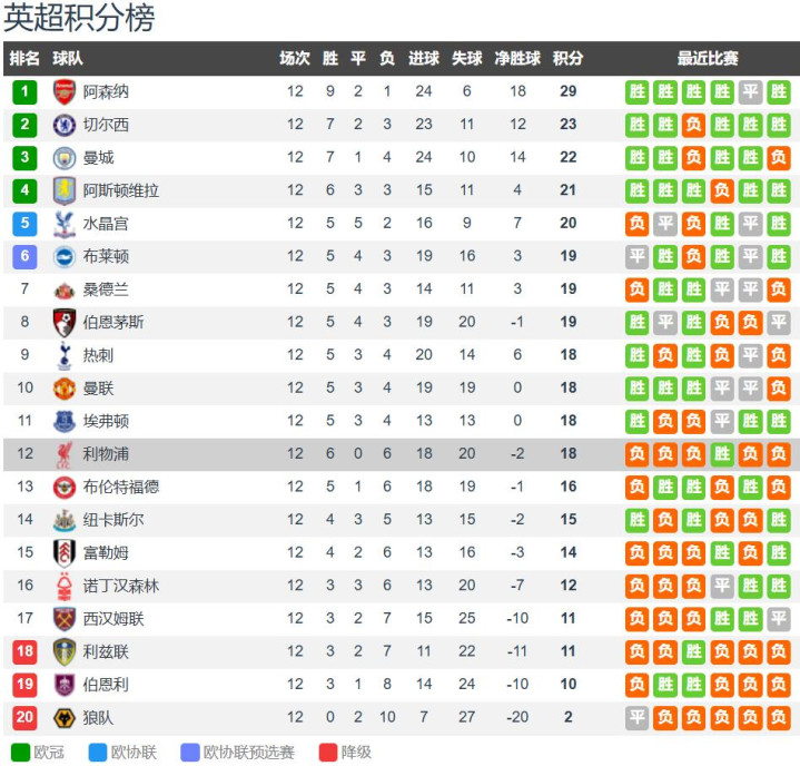 英超12轮战罢,利物浦6胜6负积18分排名第十二配资之家论坛,处于下半区!